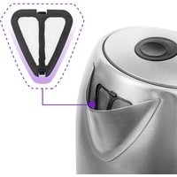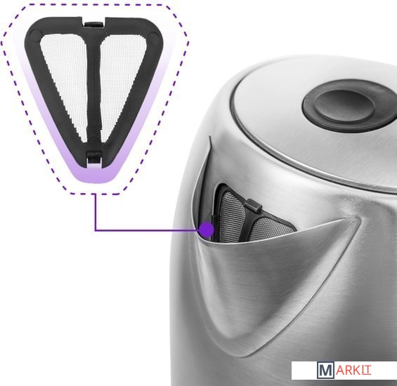 В носике чайника расположен съёмный фильтр, который задерживает частички накипи и предотвращает их попадание в чашку.