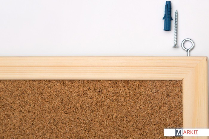 Пробковая доска в деревянной рамке. Поверхность доски из натуральной мелкозернистой пробки. Возможность прикрепления информации с помощью кнопок-гвоздиков и булавок. Рамка из натурального дерева. Скрытое крепление к стене в двух углах.