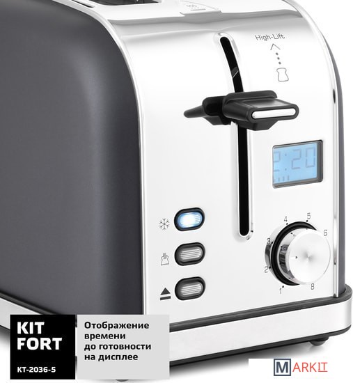Тостер оснащен поворотным регулятором степени обжаривания, тремя кнопками со световыми индикаторами и жидкокристаллическим дисплеем.
